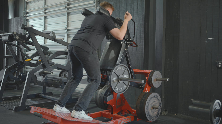 Position yourself on the platform with your shoulders resting against the neck rest and hands on the handles. Load the appropriate resistance, then use the unrack lever to safely disengage the weight. Brace your core, push through your heels, and descend into a squat by bending the knees until you reach a comfortable depth. Drive up under control through your legs back to standing.