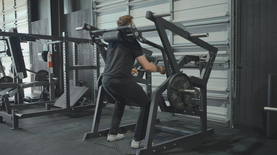 Adjust your position so your shoulders rest comfortably against the neck rest, load plates on the resistance pegs based on your training goal, set the depth stopper to your desired squat depth, grip the handles, and press through your feet to stand. Control the descent until you reach the depth stopper, then drive up through your heels and complete the rep. Use the lever unrack system to start and finish sets smoothly and safely.
