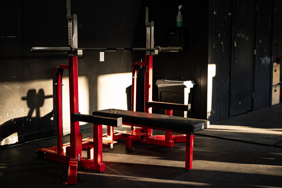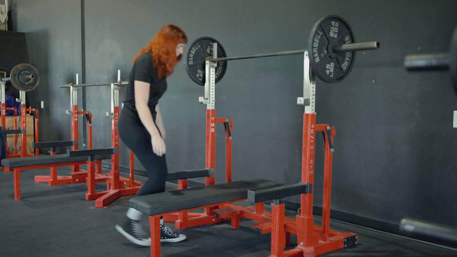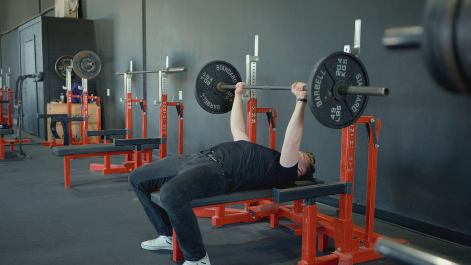 Lower the support pins to bench height and set the safety pins just above chest level. Lie back with eyes under the bar, unrack smoothly, and press while staying tight through the upper back and core.